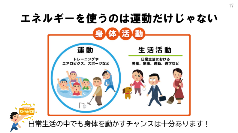 日常の生活動作も大事な運動習慣だと位置づけて、日々コツコツと将来の健康につなげていきましょう。
